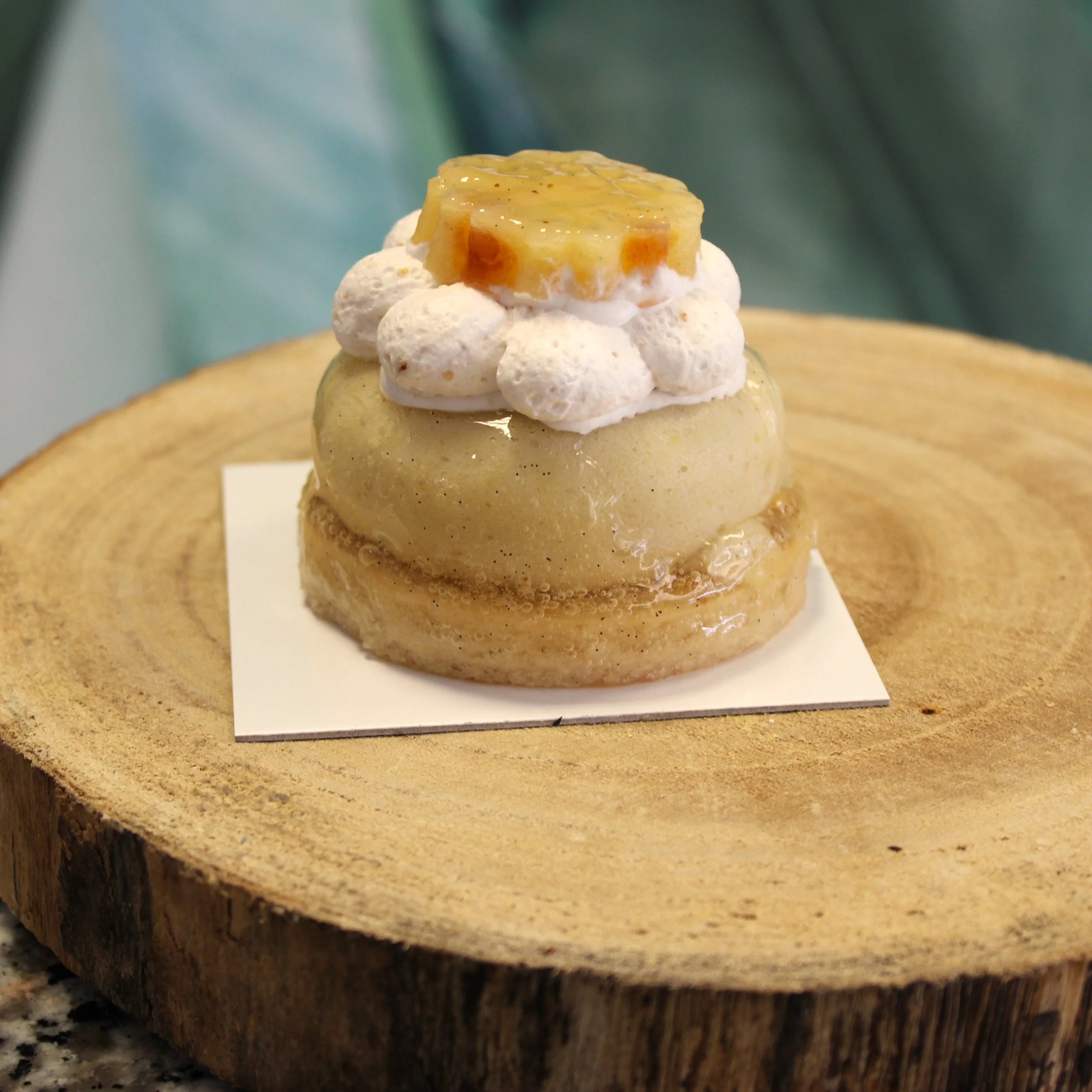 Biscuit moelleux noisette, mousse poire, cœur coulant praliné noisette, confit de poire, chantilly noisette