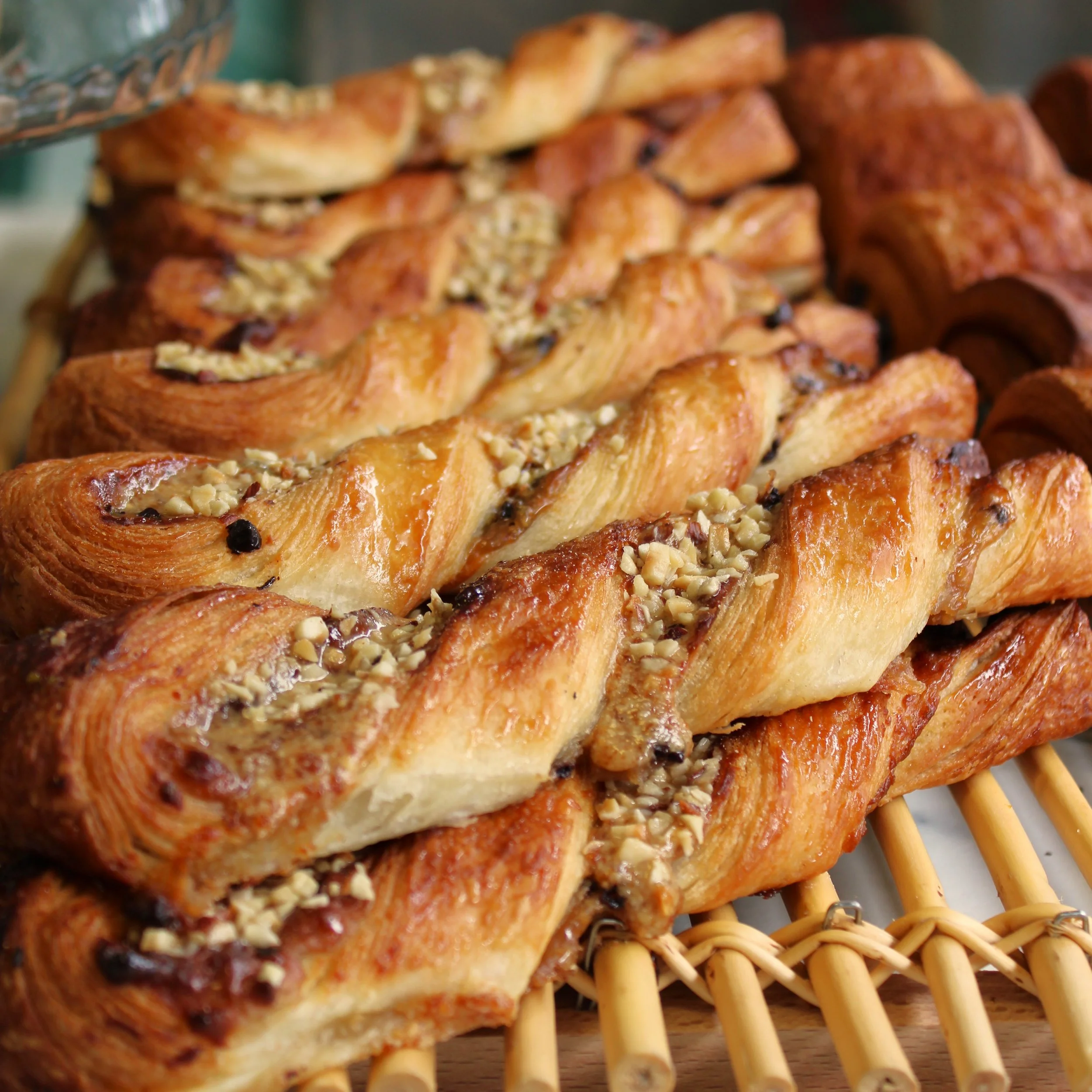 Pain au chocolat1,60€ Roulé pistache2,10€ Croissant1,40€ Feuilleté suisse1,80€ New-York roll4,50€ Torsade noisette2,10€